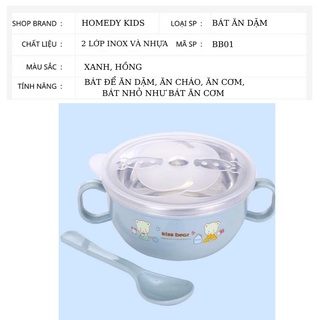 + 1 bát (chén) 2 lớp: lớp trong là inox chống gỉ, lớp ngoài là nhựa có in hình ngộ nghĩnh xinh tươi.