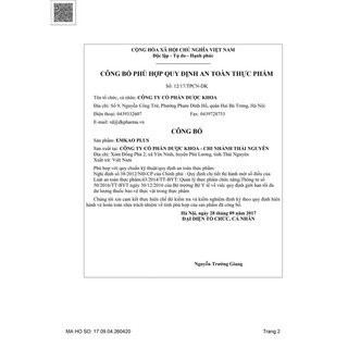 Thực phẩm bảo vệ sức khỏe (TPBVSK) Emkao Plus 5ml được sản xuất bởi Công ty Cổ phần Dược khoa, có số xác nhận công bố là 321/2015/ATTP – XNCB.