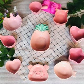 Sứ: Tim hồng nhỏ, Tim đỏ nhỏ, Tim trắng nhỏ, Tim méo đỏ, Tim méo hồng, Gáo chấm bi cam, Voi xanh dương, Heo vàng, Cá hồng, Cá xanh dương, Cá vàng, Tim dâu, Dâu xanh, Chanh vàng lá xanh, Củ cải hồng, Củ cải xanh, Táo vàng mini, Gáo bi hồng, Gáo viền vàng, Bát xương rồng XL, Pikachu, Heo hồng mới, Bát thỏ hồng mini, Bát mèo trắng mini, Đĩa khế xanh lá, Đĩa khế hồng, Thỏ xanh 100ml, Cún 100ml, Đĩa khế xanh dương, Chanh xanh lá xanh, Đĩa khế cam, Đĩa dứa xanh dương, Chén KL tam giác90ml