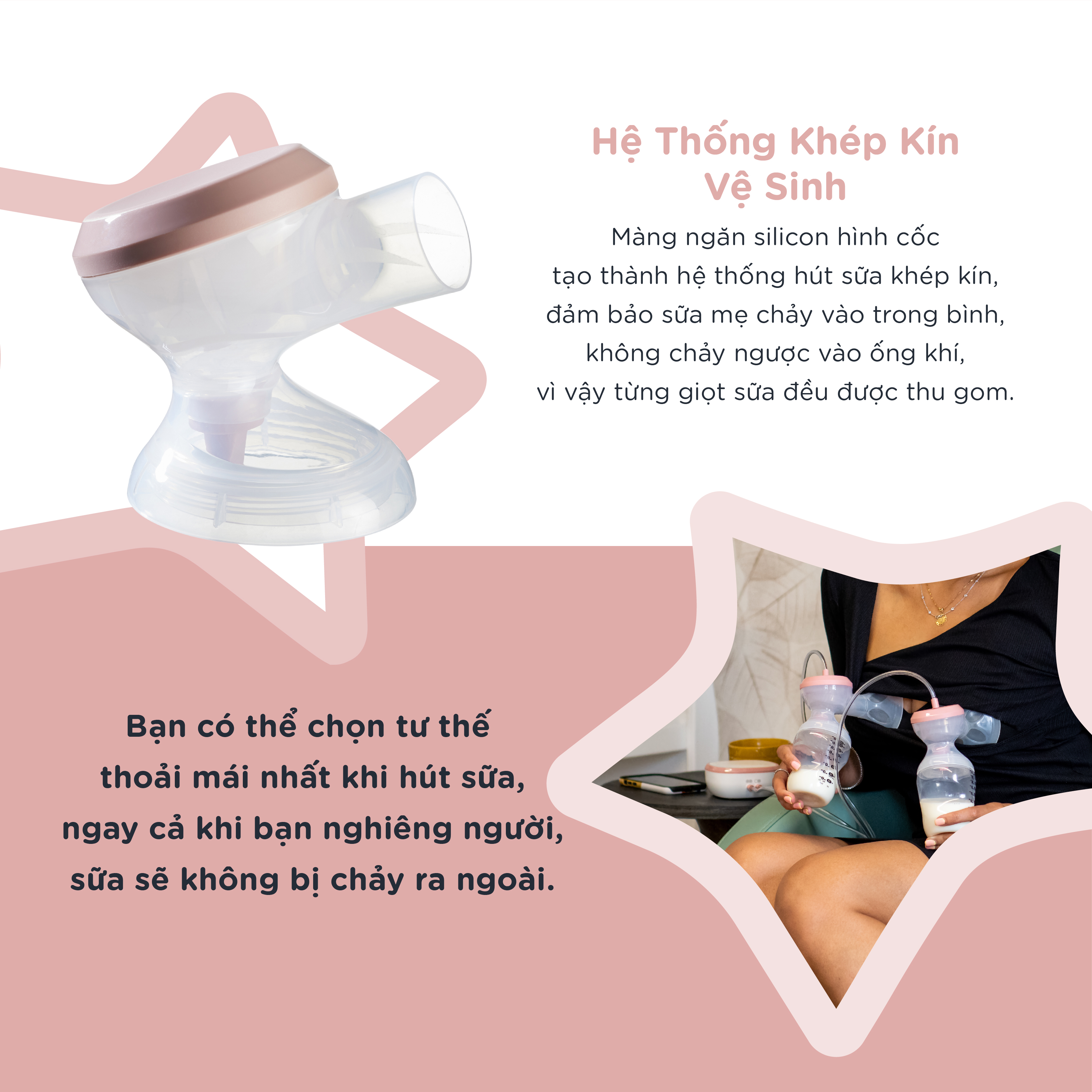 Sữa có chảy ngược không? Không! Hệ thống khép kín rất vệ sinh đảm bảo rằng sữa mẹ chỉ chảy vào bình, không chảy ngược hay tràn, nhờ đó bạn sẽ không lãng phí một giọt sữa nào.