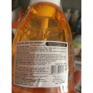 - Nước rửa bình sữa Wesser 500ml được chiết xuất thành phần tự nhiên từ quả bưởi của Hàn quốc nhẹ nhàng lấy đi các chất cặn đặc biệt là: vết mỡ, protein bám dai trên mặt bình sữa, núm vú. Đồng thời giúp khử mùi hiệu quả, loại bỏ mùi sữa còn vương vấn trong bình sữa bé. Sản phẩm của thương hiệu Wesser gắn liền với các sản phẩm chăm sóc cho bé từ những ngày tháng đầu đời, với mong muốn đem tới những điều tốt đẹp nhất cho bé.