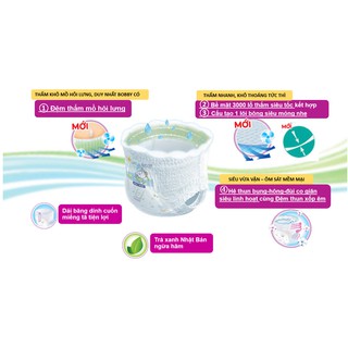 Tã Quần Bobby vẫn giữ 02 đặc tính quan trọng là: Trà xanh Nhật Bản và Dải băng dính cuốn miếng tã thuận lợi